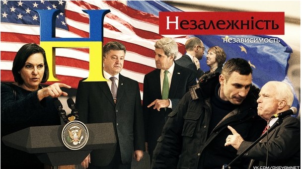 The video was made by Okeyam Nyet [No Okays] an anonymous person or collective which has an account on VKontakte with about 2,300 members currently, describing its work as “anti-Western creativity.” The account was opened in April of this year, and has posted various anti-Kiev memes and hate-posters against the Russian liberal opposition. Typical is its “Maidan Alphabet” series which creates negative memes out of the letters of the alphabet, for example “N” for Nezalezhnist‘, the Ukrainian word for “independence” — showing the EU and the US pulling the strings on Kiev.
