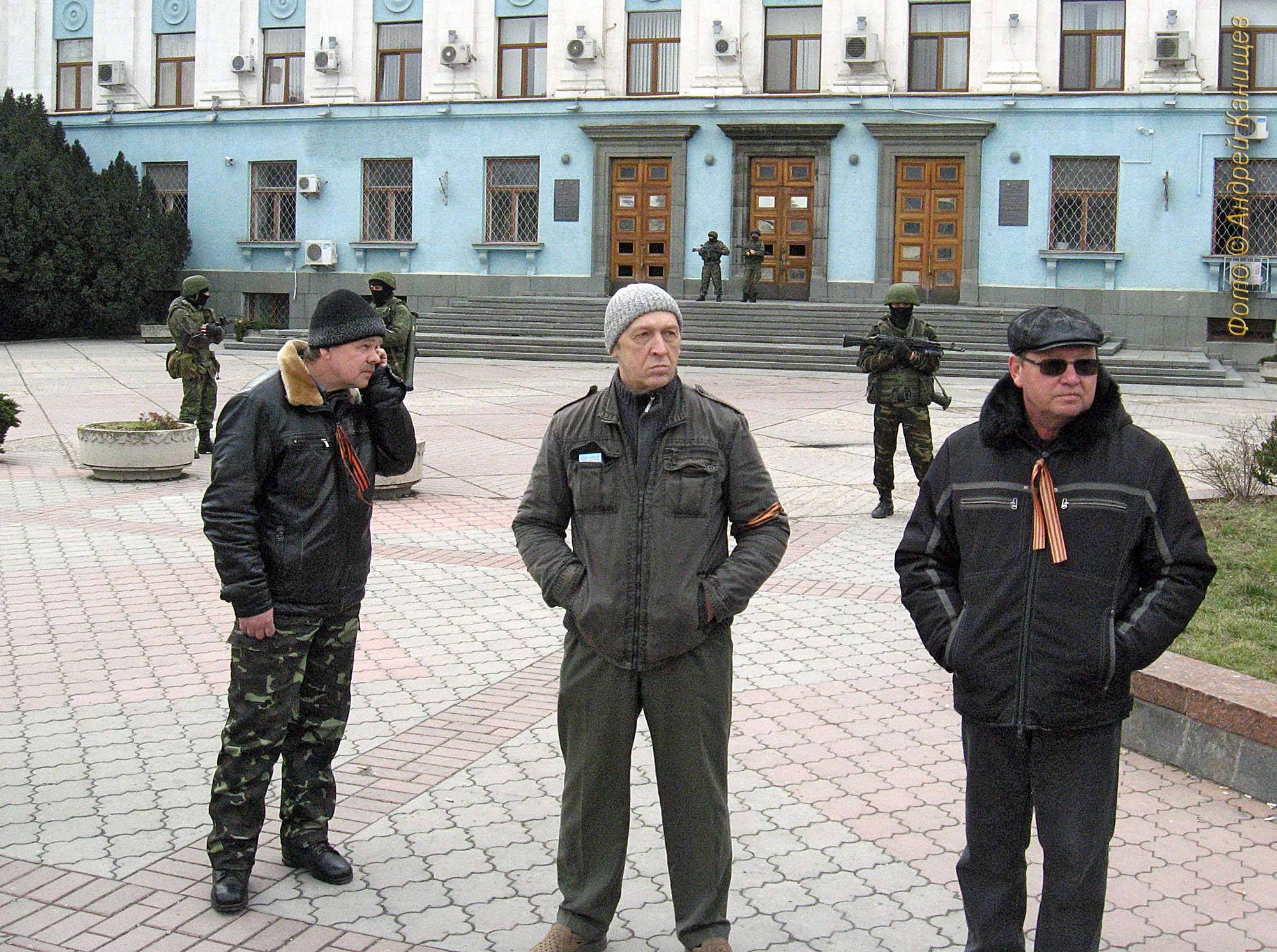 Hundreds of armed Russians surrounded Kremlin military installations in Crimea, where Moscow leases Soviet-era bases from what is now independent Ukraine. The men, called up from retirement or inactive status with Russia’s Black Sea fleet, sported black-and-orange ribbons celebrating the Soviet victory in World War II or red armbands identifying themselves as “volunteers of the autonomous republic of Crimea.”