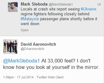 Bennett has received confirmation from the Spanish embassy that “Carlos,” a man who made similar claims during the Maidan protests, does not exist. Bennett tells us that, “he was posting yesterday that he was a Spanish controller in a tower that was taken over by soldiers as events unfolded. As far as I know, he was the source of the ‘MH 17 tailed by two Ukrainian fighters’ story. He’s been quoted quite a bit on RT [the Russian state-operated propaganda network] since yesterday, and gained several thousand new Twitter followers in just a few hours.”