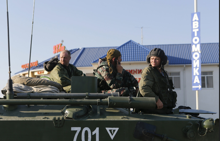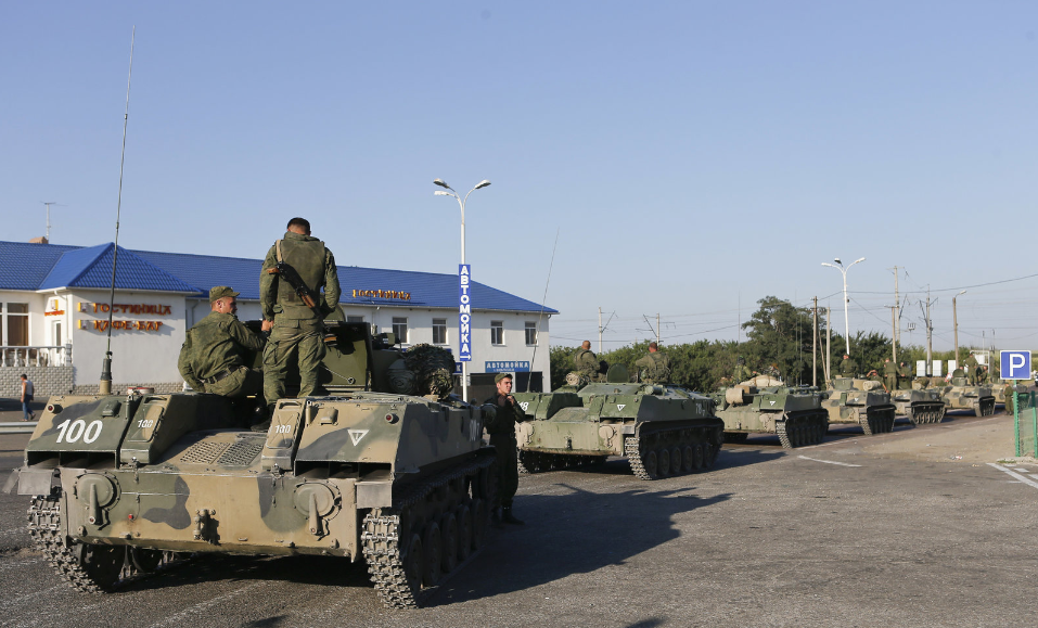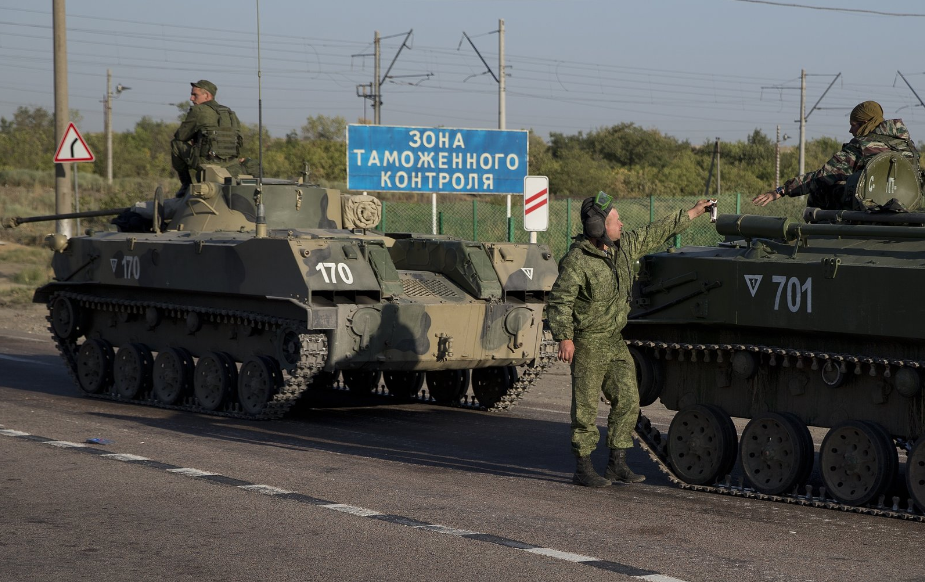A Russian BMD-2 infantry fighting vehicle (IFV) leads a column near the border. This vehicle is used by Russian Airborne forces (VDV) who formed key components of the Crimean invasion.