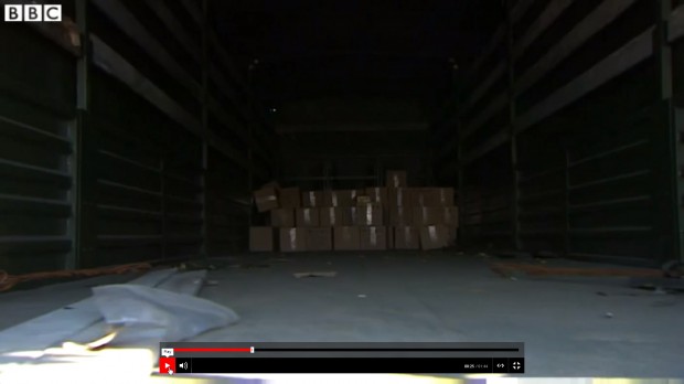 Almost all of the vehicles are nearly empty, according to journalists who were allowed to inspect them. BBC’s Steve Rosenberg finds a vehicle reportedly carrying buckwheat — nearly empty. This is a screenshot from his video report.