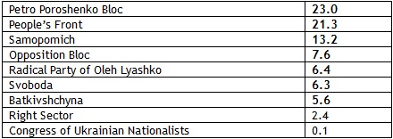 Vienna, October 26 – On October 26, 2014, Ukrainians voted in the early parliamentary elections. Ukraine currently has a mixed electoral system (50% elected from party lists and 50% elected from constituencies or single-member districts) with a 5% election threshold. Here are the results of the National Exit Poll 2014 (I mention only those parties that seem to be entering the parliament and the parties which can be termed as far right):