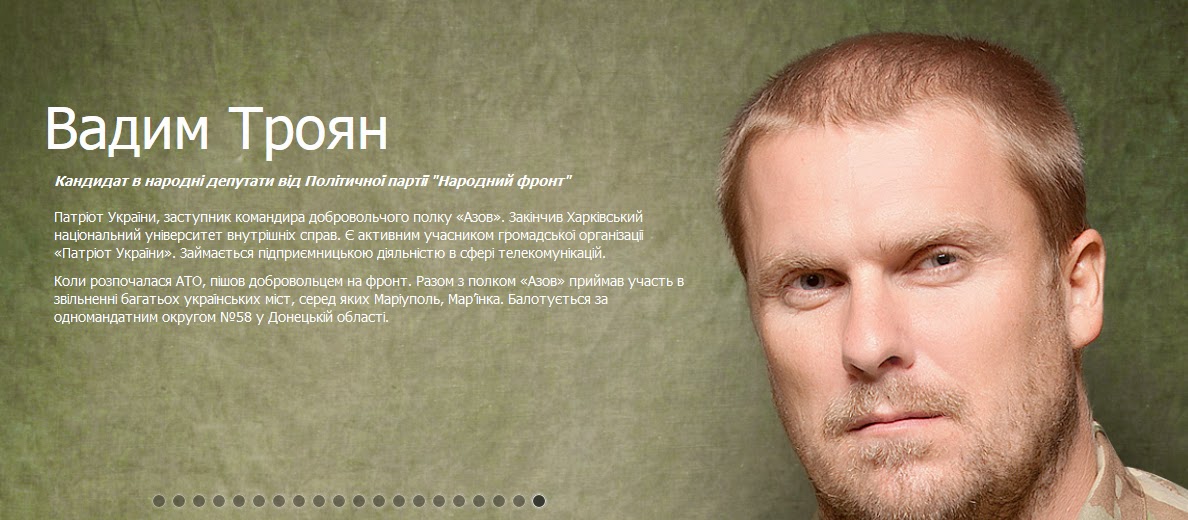 Vadym Troyan of the Social-National Assembly/Azov regiment advertised on the web-site of the presumably democratic People’s Front party
