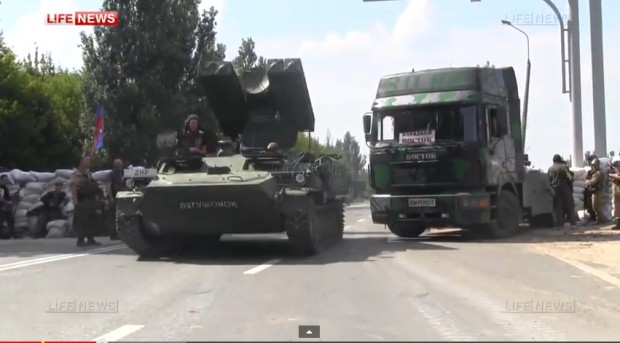 Screen grab from LifeNews video 10 July 2014 of Strela driven past separatist checkpoint in Donetsk, believed to have come from Russia.