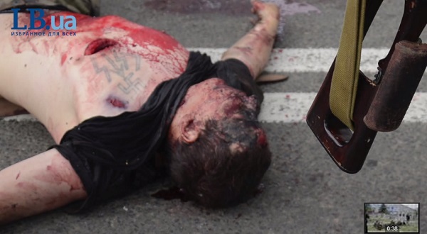 Here is a video from LB.ua showing separatist fighters in Karlovka following the battle. The blue truck bearing the words “Donbass Battalion” now has a St. George’s ribbon tied to it. The video shows at least two bodies. One of the corpses wears camouflaged trousers but also a black t-shirt. On his chest, Nazi symbols including a swastika and sig runes are clearly visible.