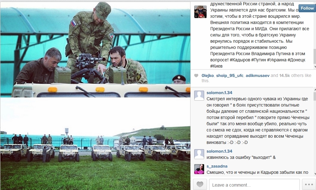 “Ukrainian sources are replicating statements that some ‘Chechen divisions’ from Russia have invaded Donetsk. I officially announce that this does not correspond to reality. There are no ‘Chechen servicemen’ much less ‘military columns from Chechnya’ taking part in the conflict. Chechnya is one of the the subjects of the Russian Federation and in accordance with the RF Constitution does not have armed forces. If in the zone of conflict someone saw a Chechen, then that is his personal affair. There are three million Chechens and two thirds of them live outside the borders of the Chechen Republic, including in the West.