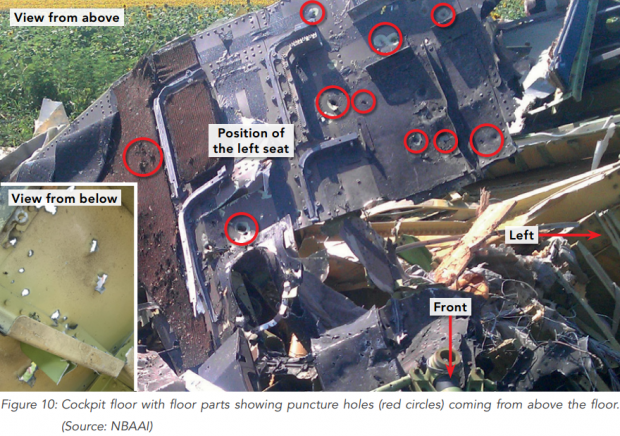 Furthermore, the shrapnel that entered the aircraft did not come from behind or beneath the aircraft, as one would expect from fire from an Su-25 which was allegedly, according to the Russian military report, consistently behind or below MH17 (no evidence exists to back this claim). Many of the projectiles documented in the Dutch Safety Board report entered the aircraft “from above the level of the cockpit floor.”