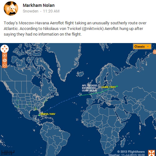 Edward Snowden, the NSA whistleblower and American fugitive, may be on a flight right now to Havana, Cuba. If so, from there, he is likely traveling to Venezuela. As the flight pattern above (supplied by Storyful’s Markham Nolan) demonstrates, the plane reportedly took a strange deviation in its flight path that appears deliberately designed to avoid U.S. airspace.