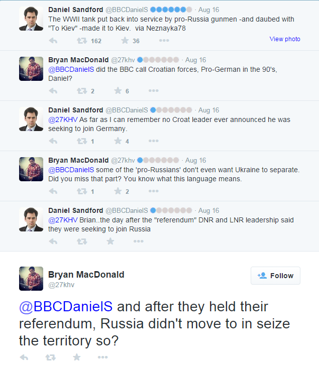 MacDonald has had several spats with Ukrainian, Russian, and Western journalists, and on one occasion called for the BBC to discipline a journalist for tweeting opinions that apparently differ from MacDonald’s:
