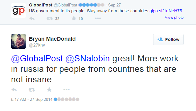 MacDonald promptly responded to questions when asked directly via email. There was one question, however, in which MacDonald’s answers were not forthcoming — the subject of Russian language schools in Moscow. As we’ve stated, during an interview on the Sue Nunn show, Nunn said that MacDonald ran language schools in Moscow, a statement MacDonald did not deny. Yet when he was asked about this on Twitter (see picture above) he was evasive and never answered the question. We asked MacDonald the name of Russian-language school in Moscow where he worked, and this was his entire reply: