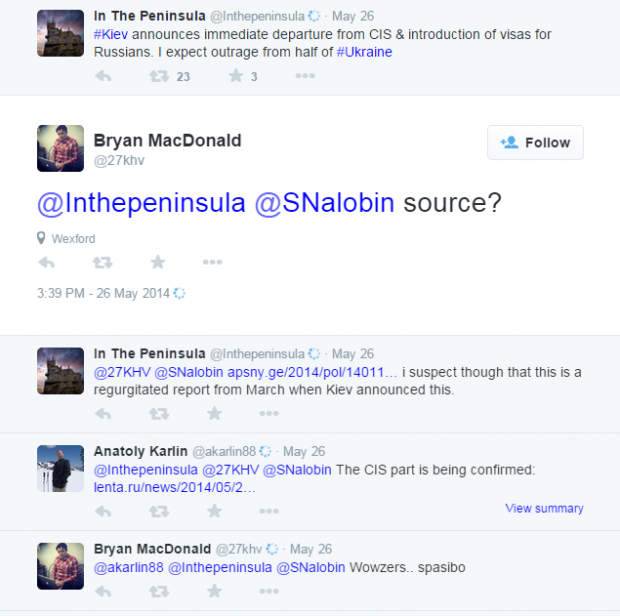 To many, the RT segment on Carlow would have been their first introduction to MacDonald, but to journalists who have been covering Russia, specifically its foreign policy, the spot set off many alarm bells. For months, as we’ve seen, MacDonald’s Twitter account had been engaging Western journalists, and MacDonald soon became especially well-known to users of the Irish news agency Storyful which has played several crucial roles in the media coverage of the crisis in Ukraine.