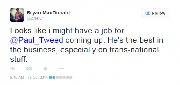 Finding information about “Bryan MacDonald” is not easy. Googling his name produces a confusing web of results, partially stemming from the multiple spellings of his name and partially owing to the fact that Bryan MacDonald has deleted thousands of tweets, and his entire blog. There is a Wikipedia entry, written by an anonymous author, which, after an in-depth investigation, turns out to be very revealing but at first glance only confuses the issue even more.