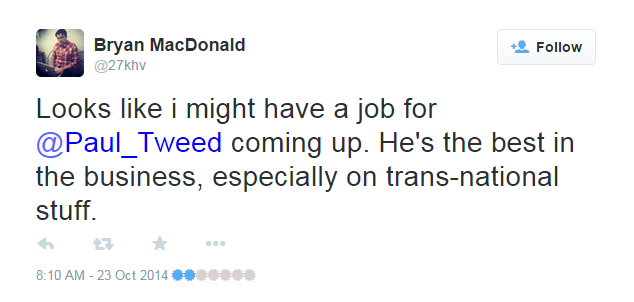 Immediately after one of these exchanges in email, MacDonald tweeted out that he might try to hire international media lawyer Paul Tweed, which could be read as another threat: