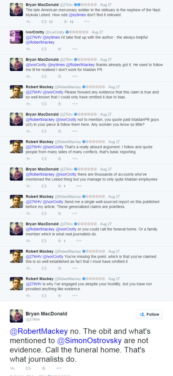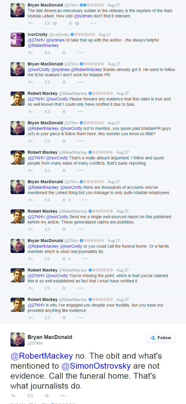 But when journalists refuse to be directed, it is not unusual for MacDonald to resort to a different tactic: bullying or attempting to discredit journalists and activists to silence those who carry a different narrative than the one he is working to advance. Take, for example, this exchange where MacDonald bashes New York Times editor Robert Mackey, even throwing a jab at Vice News’s well-know journalist Simon Ostrovsky (note — RT’s Ivor Crotty is the other account in this conversation):