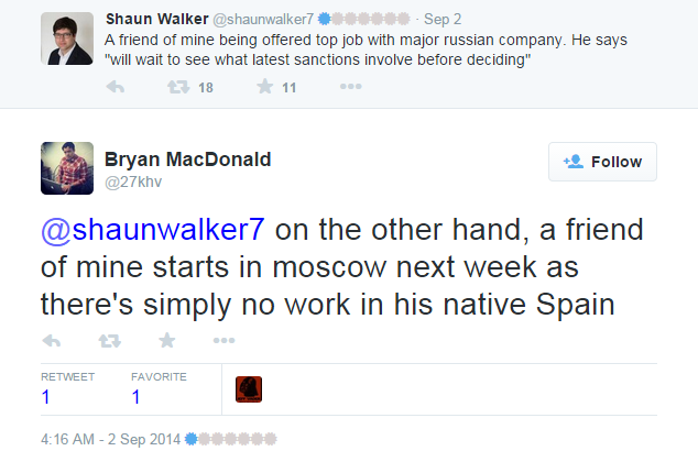MacDonald’s Twitter account has been observed by The Interpreter and other sources as having interacted with or having tagged Nalobin in multiple conversations. Searching for both Nalobin and MacDonald’s handles reveals that they have had interactions, often about the Russian news network RT, RT contributor Graham Phillips (who was detained several times by the Ukrainian government), and other topics. The two have interacted dozens of times, with most of the interactions coming between the first known interaction on May 18 and August 18, 2014. It’s not clear whether in some of the conversations some tweets have been deleted, since many of the conversations appears to be one sided. An example: