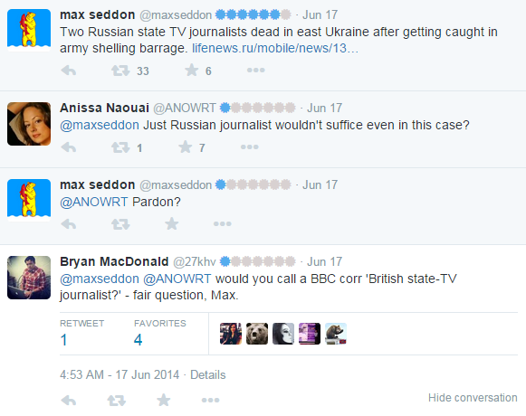 This is a modest self-assessment. Regardless of who employs MacDonald, where he makes his money, or whether he has deeper contacts within the Russian government, MacDonald was at least partially responsible for the rise of Graham Phillips, a pro-Russian freelancer whose work first appeared in the Western press and who has gone on to become a key part of the Russian state-operated media coverage of the conflict in Ukraine. MacDonald became a contributor to an important forum, the Storyful Open Newsroom, established for journalists to discuss developing and often murky news stories. Through Twitter, MacDonald has regularly interacted with the most prominent Western journalists as far as the media’s coverage of Ukraine and Russia is concerned. Now MacDonald is writing a column and is a regular guest on RT, which, as MacDonald himself argues, has tremendous reach. MacDonald has done this while using an ever-changing and mysterious resume (is he “not a journalist,” a “former” journalist, or a journalist? What is his expertise? Does he have a business or personal stake in events in Ukraine?). And all along, MacDonald has consistently threatened those who ask these perfectly legitimate questions about his credibility, expertise, and motivations.