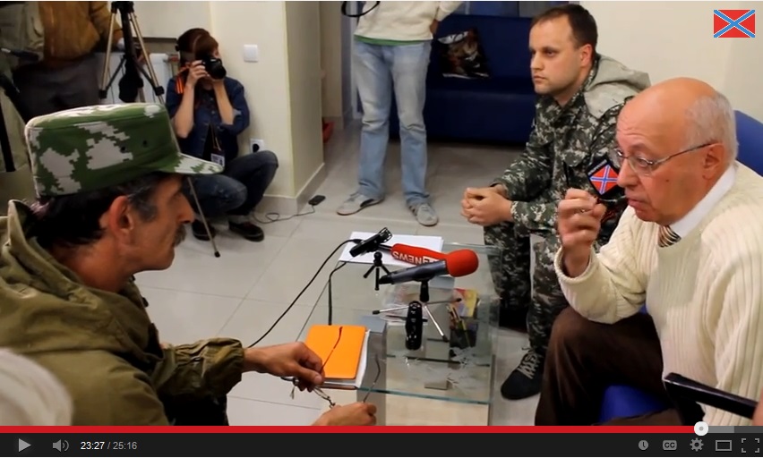 At this point a man who had been crouching down out of view takes the floor. He is introduced as “Mikhail” and gives his title as “chief of staff” of the militia; he is none other than Igor Bezler. While he is filmed from the back of his head and is wearing a cap and later glasses (and in other versions of the video his face is blurred out), occasionally he turns to the side, and his lisping voice, known from other famous videos (his takeover of the police forces of Gorlovka and his “fake execution“) is unmistakeable. But Kurginyan clearly fails to recognize who he is.