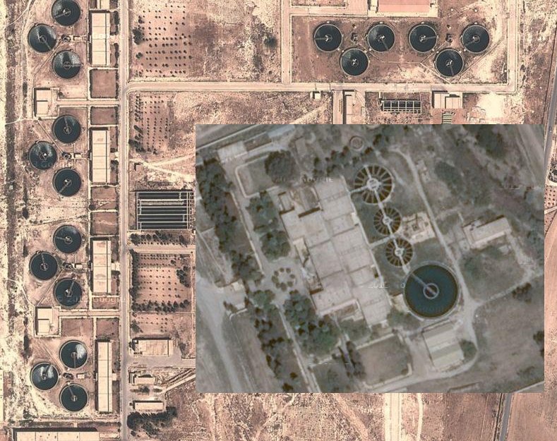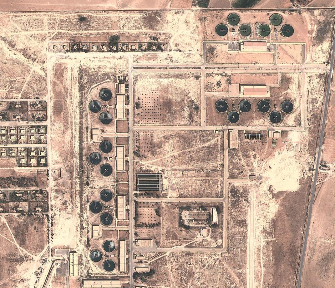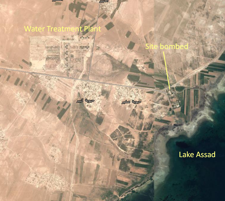 Note that the site is located on the shores of Lake Assad and compare the tanks with those at a larger site, labelled no later than two years ago as a water treatment plant on Wikimapia:
