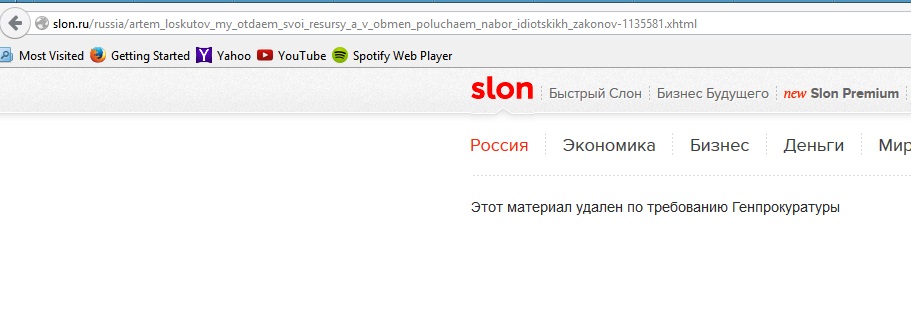 An interview with march organizer Artyom Loskov published 2 August in slon.ru about the “March for the Federalization of Siberia” planned for 17 August led to Slon.ru getting a notice from the Prosecutor Generals’ office and removal of the page by the state censor, Roskomnadzor. Now only the “Removed” notice is viewable, although it can still be found in Google cache. Under a new law, calls for separatism or secession within Russia, or vaguely-defined “extremist” statements can lead to criminal prosecution and also media censorship.