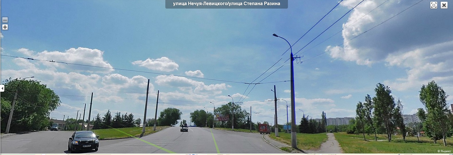 – and while you are looking around 360 degrees in Yandex Street View, be sure not to be run over by the trolleybus heading your way — here’s the view of its wires — yes, like Krasnodon, Lugansk has a trolleybus system, a detail critical to challenging the false geolocation by the Russian Defense Ministry.