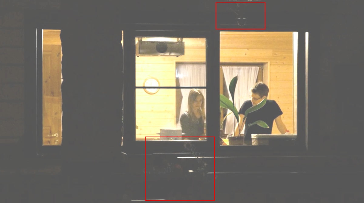 As for the kitchen picture, Poitras has obviously darkened and distorted it to remove clues to its whereabouts. But if we lighten it up, we can see a flower in a flower box in front of the window, and some sort of other object — a video camera?