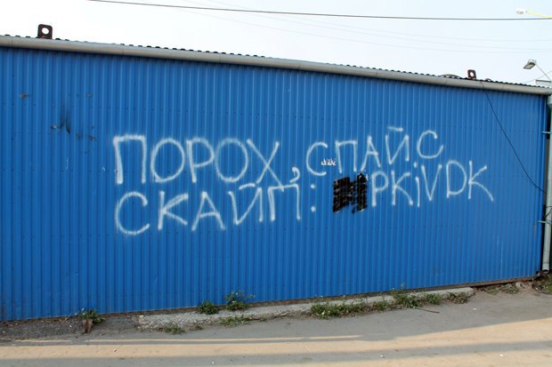 Sign on a wall in a Russian city offering “powder” and “spice” for sale via a Skype address. Photo by The Village.