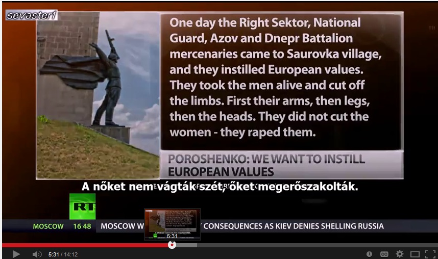 2000GMT: "Truthseekers," a sensational program by RT.com, the Kremlin's major propaganda outlet for the West, ran an outrageous program today falsely claiming a "genocide" by Ukrainian forces of ethnic Russians in southeastern Ukraine. It's typical of the lurid anti-Ukraine war propaganda we've been monitoring which Russian state media is using to fuel public hatred of the Kiev government.