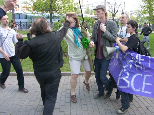 “Looking at the correlation of forces, I began to understand that we patriots were much greater in number, but the pro-Russians were much better armed and organized. I thought that if they had sufficient weapons, they would kill us all or chase us away. But here is the strength of the Ukrainian people. Despite the shooting from the pro-Russian crowd, more and more of our activists went toward them. They covered themselves with garbage cans and tables from street cafes, people with rocks ran into automatic rifles. for the next several hours we blocked the pro-Russians all along the perimeter, pressing them on to Grecheskaya Street and the partly-built Afina Park. We hemmed them in mainly with barricades made of all materials at hand from all the passageways. The police all that time simply stood idle or did something incoherent. But they did not take any measures to end the conflict for sure.”