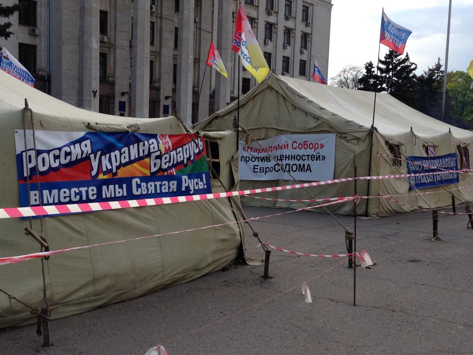 Tents in Odessa 1 May 2014. Photo by Max Motin. Signs: (L) Russia, Ukraine, Belarus Together We Are Sacred Rus’