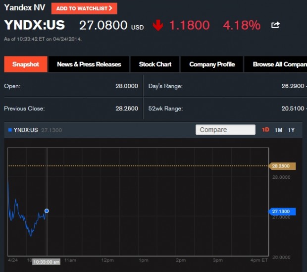 Yandex’s stock fell by 4.10% after a speech by President Putin claimed the Russian search engine was under Western pressure at Mediaforum in St. Petersburg, Bloomberg reported, and is now at $27.00.