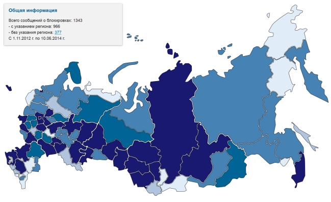 Map of 1,343 Internet site blocks in Russia; 966 show region, 377 without region, from 1.11.2012 to 10.06.2014
