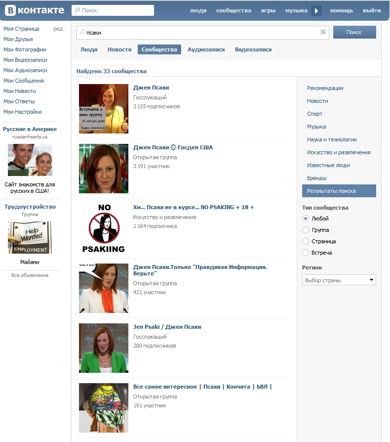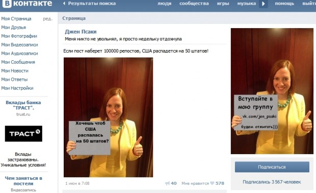 Another way to determine if a meme has staying power as the authentic voice of the people is to check whether and how many groups are made on Facebook or VKontakte. It’s telling that while Facebook has been widely-used by Russians of liberal, left and conservative political views — from Boris Nemtsov to Aleksandr Dugin — there isn’t a single group made about Psaki by Russians or anybody for that matter — there’s only the automatic page generated by the system for public figures.