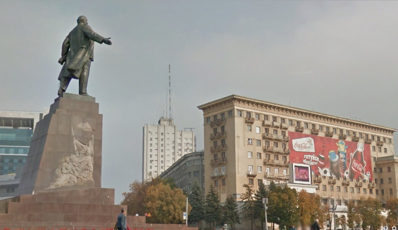 Meanwhile, Lenin’s statute in Freedom Square in Kharkiv remains on his feet, protected by pro-Soviet demonstrators this year. There are all kinds of influences on the city, however, and he seems to be pointing to an ad for Coca Cola.