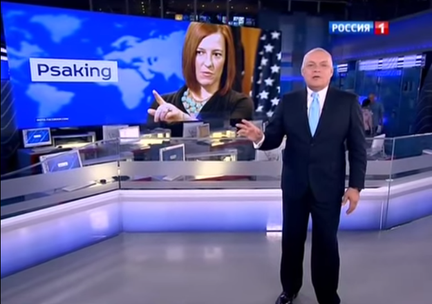 Screenshot from Dmitry Kiselyev’s broadcast inventing the term “Psaking,” which for him means “low-quality American diplomacy” in action.