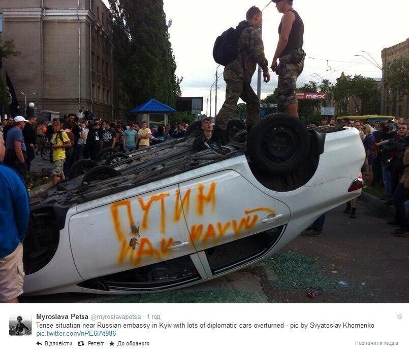People have already forgotten the downed airplane, the kidnapped journalists, and the new victims in Donetsk and Lugansk. The picture of overturned, smashed cars and explosives thrown on to the grounds of the embassy are exactly what the Kremlin needs in order to justify its aggressive actions regarding Ukraine. Poroshenko is simply obliged to restore order and punish those guilty of the provocation.