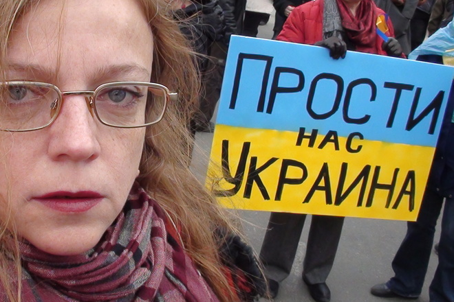 Demonstrator at the Ukrainian Embassy in Moscow with a sign saying “Forgive Us, Ukraine” 15 June 2014. Photo by Obozrevatel