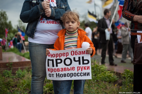 Demonstrators brought their children; here one girl is holding a sign saying “Fuhrer Obama Bloody Hands OFF Novorossiya,” referring to the imaginary country that would be created out of parts of Ukraine, Belarus, and Moldova for ethnic Russians. A second child holds a sign “Putin Defend Russian World! Defend Novorossiya!”