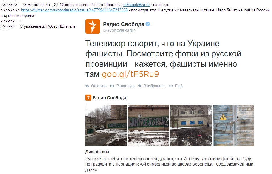 The leaked email correspondence shows Shlegel on 23 March 2014 reacting to an effort by the US-funded Radio Liberty to expose the fallacy that the freedom movement in Ukraine is made up only of “fascists” by showing the neo-Nazi graffiti visible in the Russian provinces.