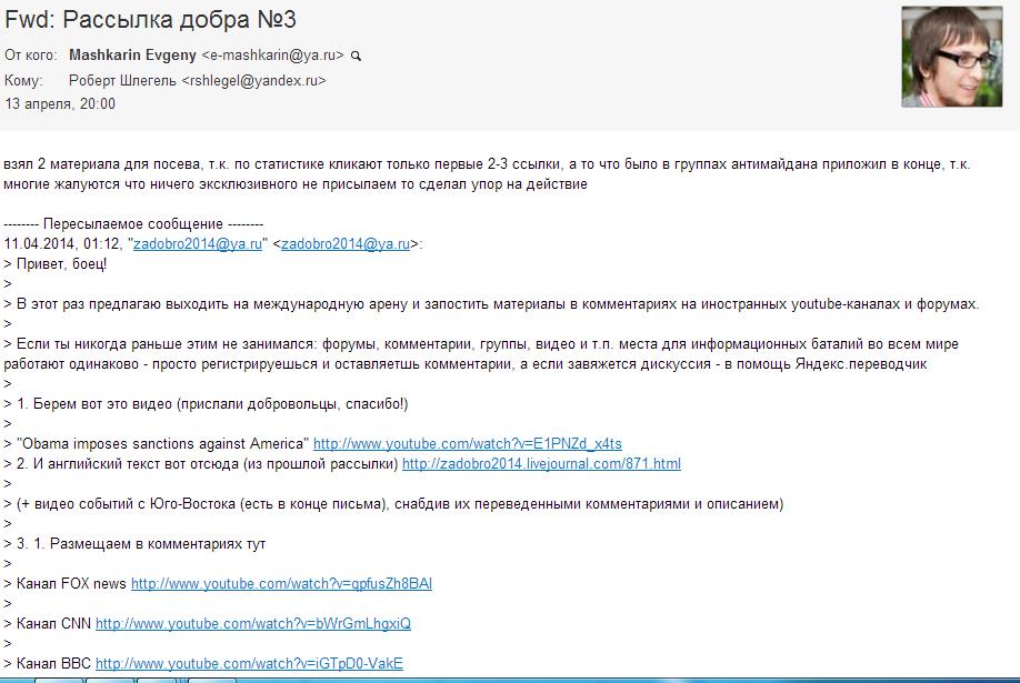On 13 April, Shlegel’s correspondence with Evgeny Mashkarin, a Duma member from Krasnodar, reveals his discussions of how to effectively seed Anti-Maidan propaganda materials into the Western press and social media.