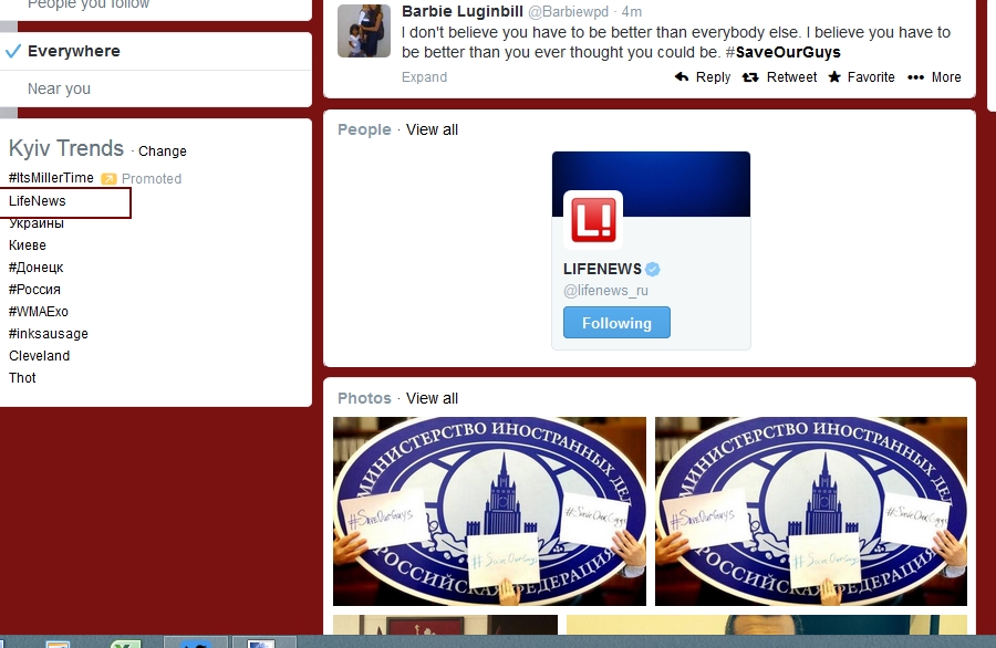 And in Kiev’s top trends, “LifeNews” but not #SaveOurGuys was in the top trending topics: