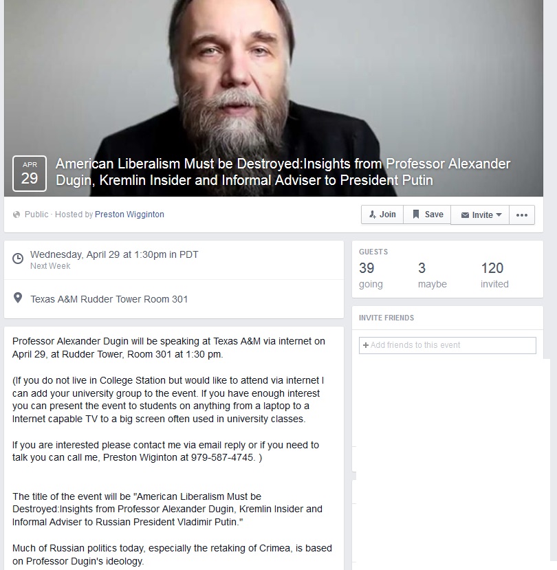 As we reported earlier, neo-Nazi Preston Wiggington is organizing the lecture of Russian ultranationalist Aleksandr Dugin at a meeting on the campus of Texas A&M University. Some Ukrainian activists are already protesting to university authorities. There has been increased scrutiny on the speeches Dugan has made on social media (on VKontakte, the Russian social media network, on Facebook, and in videos uploaded to YouTube), although digging through the voluminous amounts of speeches and comments he has posted is daunting.
