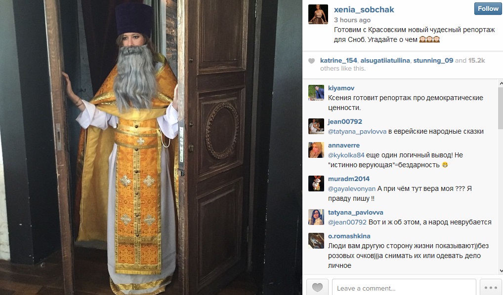 Kseniya Sobchak, talk-show host for TV Rain and magazine editor, is in a controversy again for posting an Instagram picture of herself dressed in clerical robes and a fake beard.