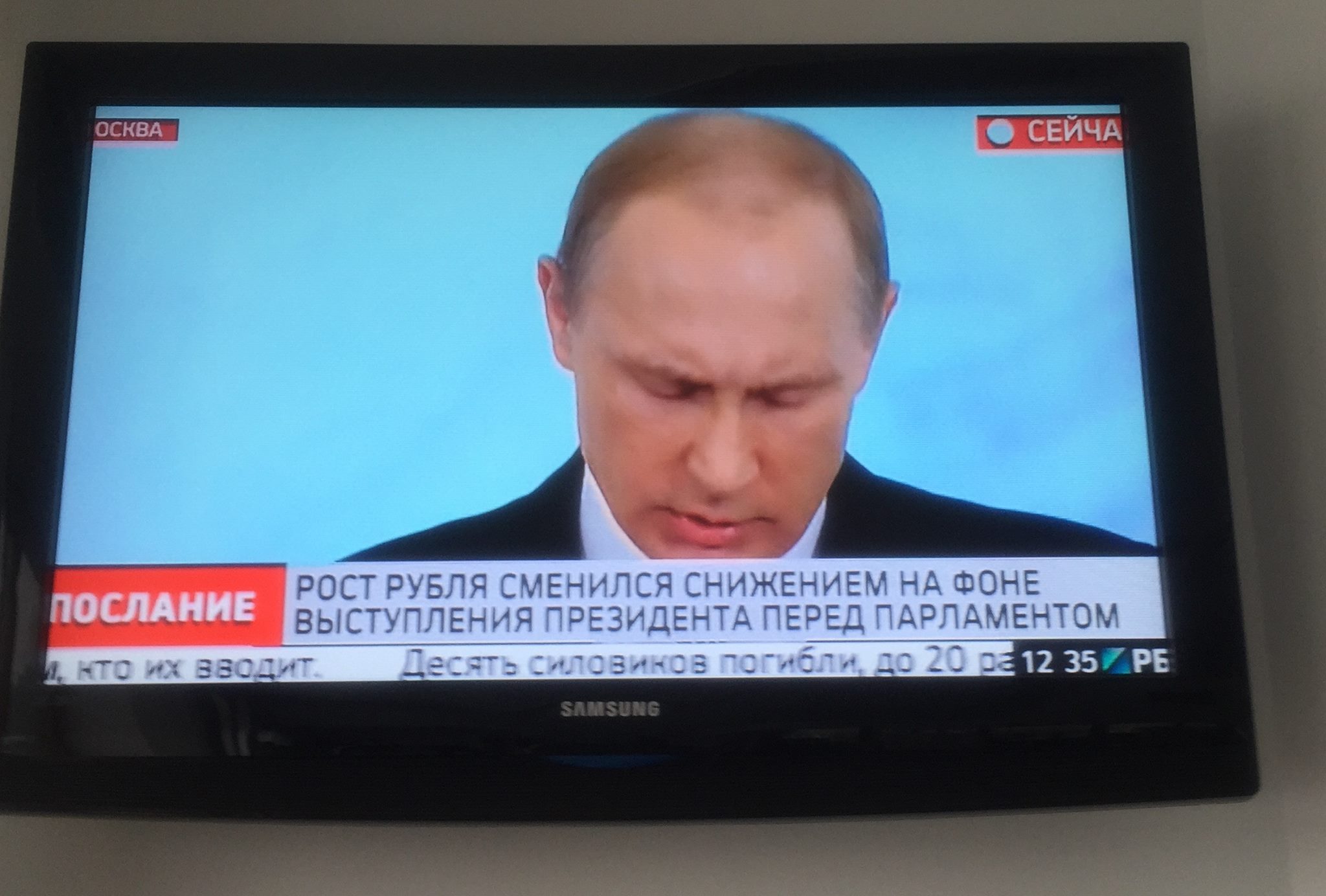 Translation: Woman in Chelyabinsk watches a TV broadcast of Vladimir Putin’s address to the Federal Assembly. Did you watch the president’s speech? Photo by Aleksandr Kondratyuk/RIA Novosti.