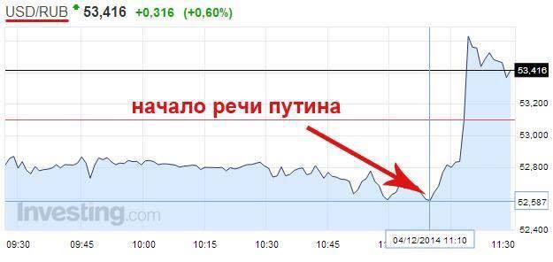 Nemtsov published a screenshot of the TV while Putin was speaking, which featured a ticker tape saying the ruble rate was improving as Putin spoke. Then he showed a chart where the ruble went up slightly today.