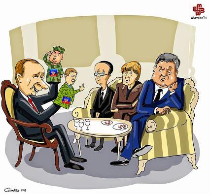 While the original Russian document now being described as “the Minsk package” has the signatures of the so-called “People’s Republics” leaders Aleksandr Zakharchenko and Igor Plotnitsky on the document, they weren’t in the summit talks between Putin and Poroshenko — a fact that gave rise to many of the political cartoons for this meeting:
