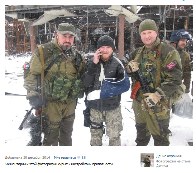 They show him posing with the infamous Russian-backed battalion commander nick-named “Motorola” who has twice broken his arm in combat – he appears to be in the ruins of the Donetsk Airport.
