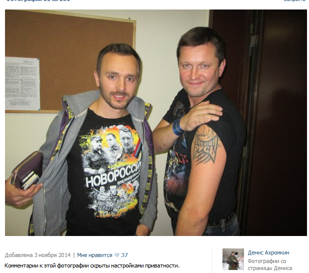 He has a tattoo of the “Militant Russia” mixed martial arts club and a friend in a “Novorossiya” t-shirt featuring Col. Igor Strelkov.