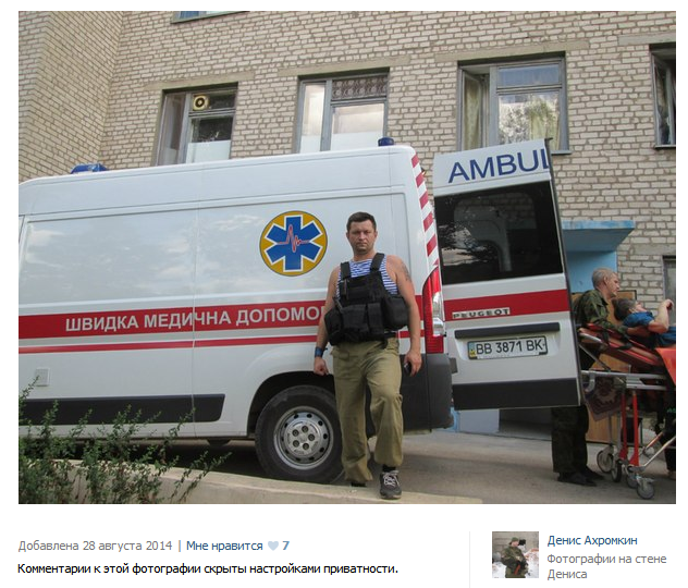 Here’s Akhromkin standing in a telnyashka, a Russian paratrooper’s t-shirt and a bullet-proof vest in front of a Ukrainian ambulance. What’s he doing there?