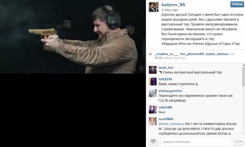 It’s hard to know what’s going on really with an Instagram over-sharer like Ramzan, but so far he is trying to portray that he loves Putin like a father, respects his authority in the Muslim world, is loyal to Russia and cooperative with the Security Council and even praised by its head — and is also keeping up his marksmanship skills.