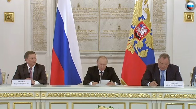 According to a report on Kremlin.ru today, Putin chaired a formal meeting on plans for the May 9 Victory Day celebrations, flanked by Ivanov on his right and Dmitry Rogozin, deputy prime minister in charge of defense on his left.